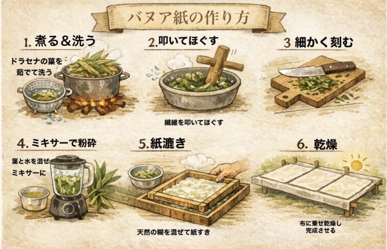 (現地の葉を使った紙が、日本で商品に生まれ変わる流れを紹介)